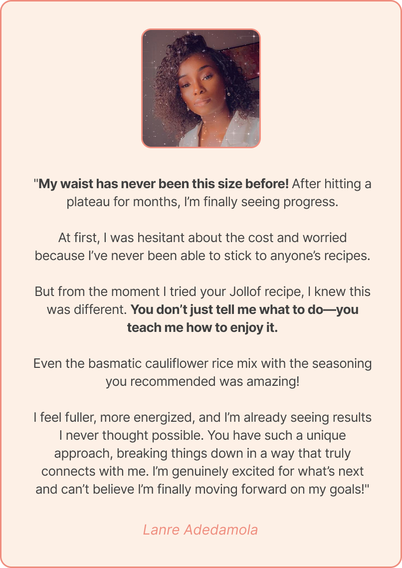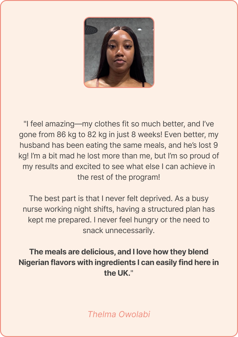 It’s a proven, habit-based fat loss system designed for African women to lose 3–10kg, flatten their tummy, and keep their curves without giving up jollof, stew, swallow, or the food they grew up on.